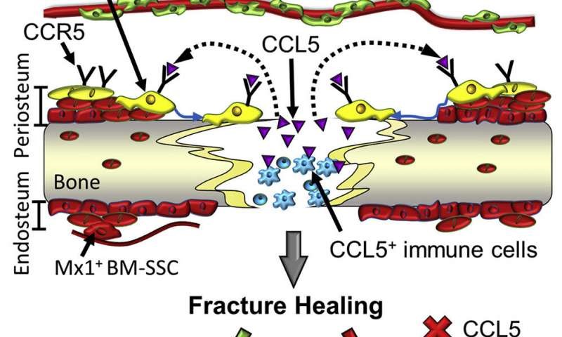 Tế bào gốc màng đáy có các thụ thể (các phân tử trên bề mặt tế bào) liên kết với CCL5 truyền tín hiệu đến các tế bào để di chuyển về phía xương bị tổn thương và sửa chữa xương. Xóa gen CCL5 trong mô hình chuột dẫn đến khiếm khuyết rõ rệt trong quá trình sửa chữa xương hoặc quá trình hàn gắn xương bị trì hoãn. Khi các nhà nghiên cứu cung cấp CCL5 cho chuột bị thiếu CCL5, quá trình lành xương được đẩy nhanh.