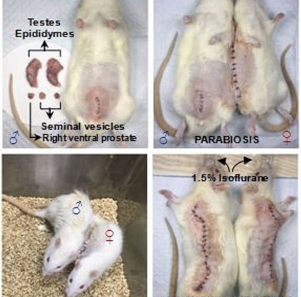 Trong thí nghiệm, hai nhà nghiên cứu từ trường Đại học Quân y Hải quân Trung Quốc thực hiện phẫu thuật gắn một cá thể chuột đực và một cá thể chuột cái với nhau, khiến chúng có chung hệ tuần hoàn máu.
