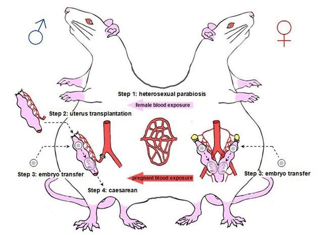 Tám tuần sau phẫu thuật ghép, nhóm nghiên cứu cấy tử cung của một con chuột cái thứ ba vào con đực. Sau đó, phôi thai chuột được cấy vào tử cung này, cũng như tử cung của con chuột cái bị ghép đôi.