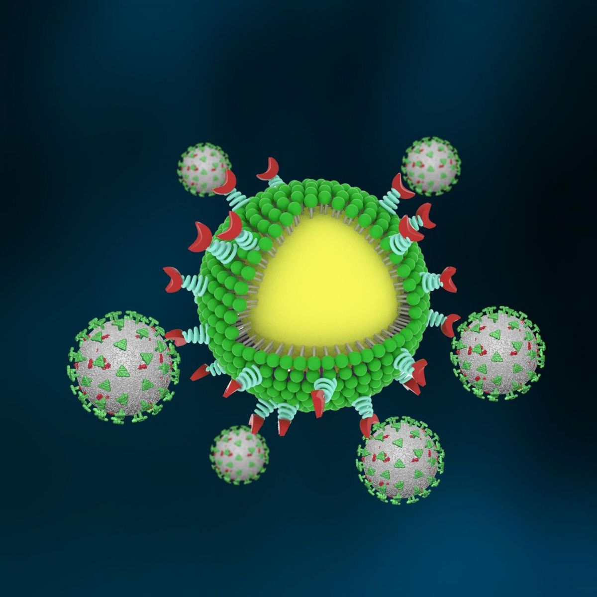 Hình vẽ mô phỏng liên kết Nanotrap SARS-CoV-2. Nanotrap có lõi màu vàng, vỏ phospholipid màu xanh lá cây và các hạt có chức năng hóa màu đỏ để liên kết virus (ACE2 hoặc Neutralizing Antibody). Lớp vỏ protein của virus có màu xám, và được phủ một lớp protein Spike (xanh lá cây) và glycoprotein (đỏ). Nguồn ảnh: Huang Lab