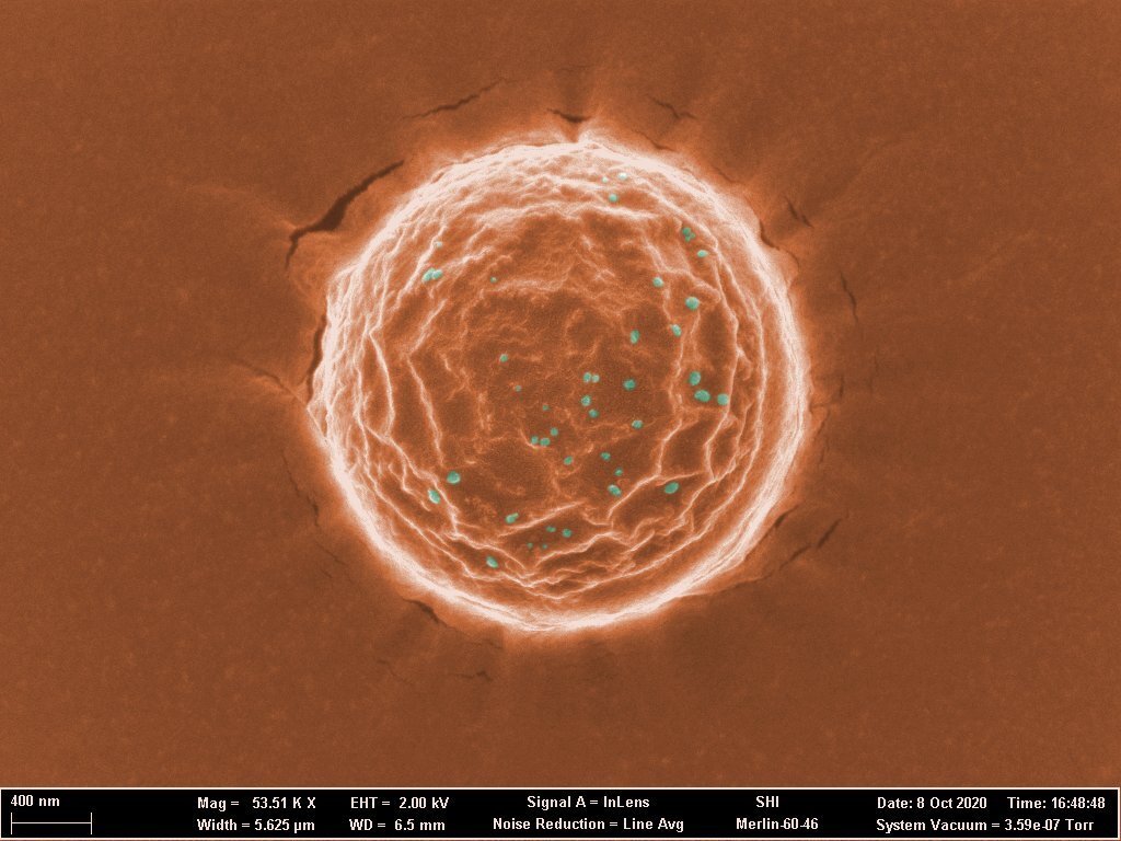 Hình ảnh kính hiển vi điện tử quét (SEM) của virus SARS-CoV-2 giả liên kết Nanotrap (màu cam) (màu lục lam). Nguồn ảnh: Huang Lab