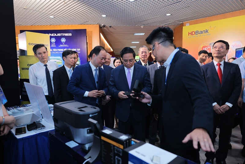 Thủ tướng Phạm Minh Chính cùng các đại biểu tham quan triển lãm Con đường 65 năm đổi mới; sách KH,CN&ĐMST; 10 năm Giải thưởng Tạ Quang Bửu; gian hàng thành tựu KH,CN&ĐMST.