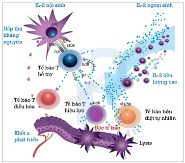 Interleukin-2 (IL-2) là một thành viên của “đại gia đình cytokine”, được sản xuất bởi tế bào lympho T, có vai trò thiết yếu trong hệ thống miễn dịch, bao gồm: dung nạp miễn dịch (Tolerance) và sự miễn dịch (Immunity) thông qua tác động trực tiếp lên tế bào T. Đối với ung thư, IL-2 có thể giúp tiêu diệt các tế bào u ác tính ở bất cứ nơi nào chúng phát triển trong cơ thể thông qua 3 bước: 1) Ngăn chặn tế bào ung thư tăng sinh và lây lan; 2) Khiến tế bào ung thư tiết ra các chất hóa học để thu hút tế bào miễn dịch đến tiêu diệt; 3) Kích thích tế bào T phát triển để đến tấn công tế bào ung thư (hình 1) [1]. IL-2 đã được Cục Quản lý Thực phẩm và Dược phẩm Hoa Kỳ (FDA) chấp thuận trong điều trị ung thư tế bào thận di căn (1992) và ung thư hắc tố di căn (1998) sau khi các thử nghiệm lâm sàng chứng minh rằng, ở một số ít bệnh nhân có đáp ứng hoàn toàn với điều trị [2].