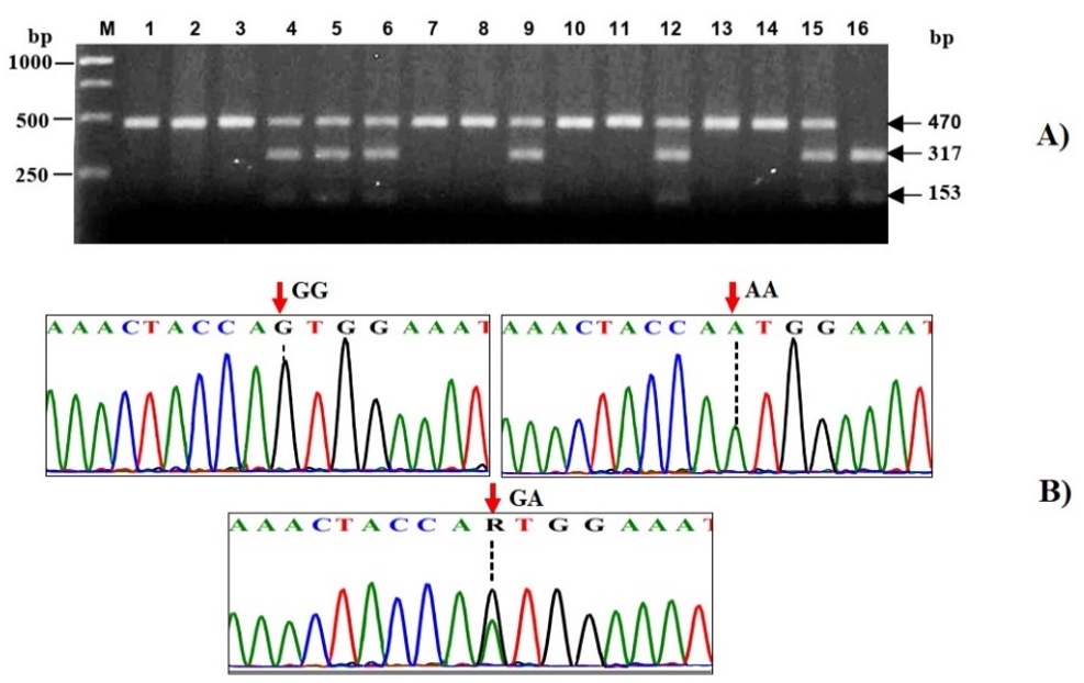 Hình 1. A) Ảnh điện di đại diện một số sản phẩm PCR nhân đoạn SLC17A1 rs1165196 cắt bằng enzyme TspRI;