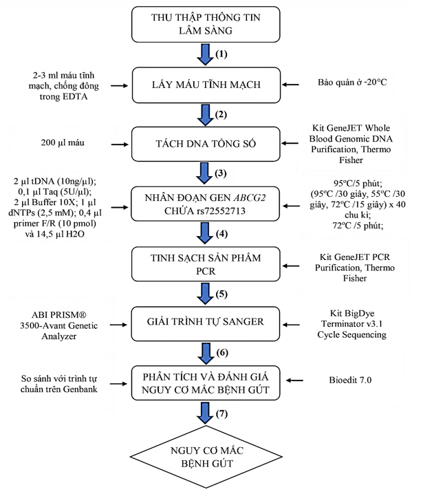 Dựa trên những kết quả nghiên cứu thu được, đề tài đã xây dựng được quy trình đánh giá nguy cơ mắc bệnh gút ở người Việt thông qua xác định kiểu gen đa hình ABCG2 rs72552713 (Hình 2).