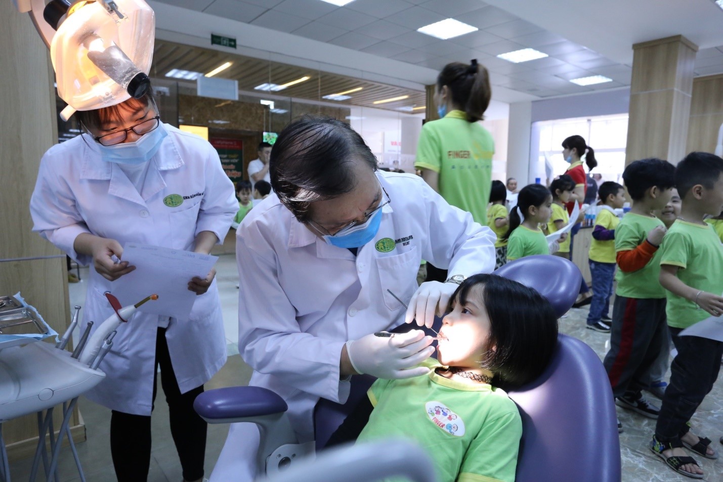 PGS.TS Phạm Dương Châu- Phó Hiệu trưởng, Chủ nhiệm Khoa Răng Hàm Mặt khám, chữa răng miễn phí cho các em nhỏ.