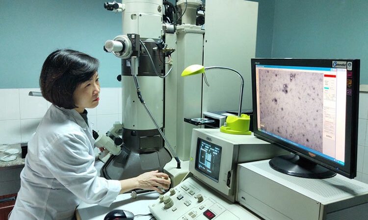 Nhà nghiên cứu Viện Vệ sinh dịch tễ Trung ương kiểm tra mẫu virus SARS-CoV-2 trên kính hiển vi điện tử (TEM). Nguồn: NIHE.