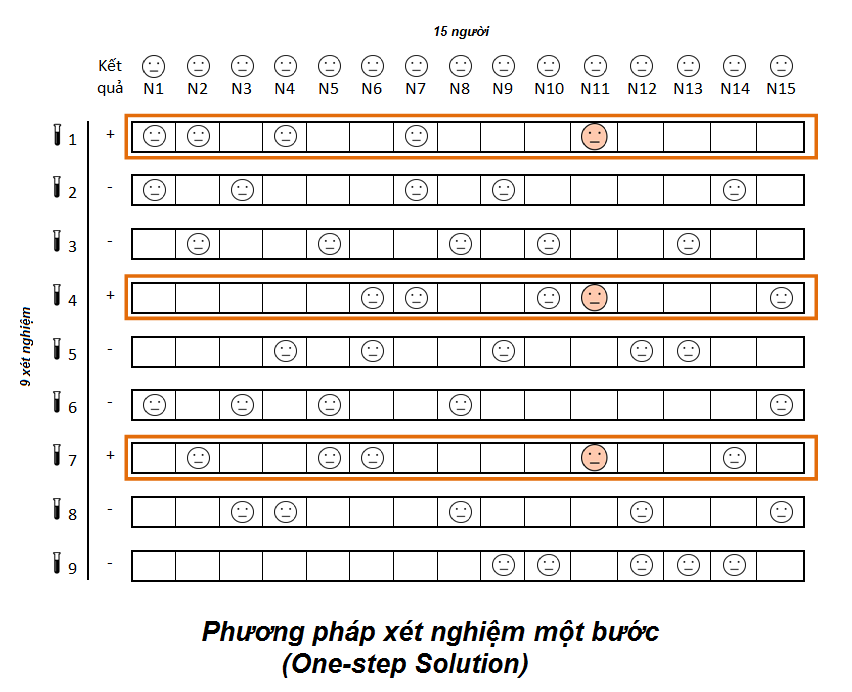 Cách 4: xét nghiệm gộp một bước (One-step solution). Theo đó, các mẫu bệnh phẩm được trộn ngẫu nhiên, không lặp vào 9 ống nghiệm, mỗi ống có 5 bệnh phẩm. Tất cả các ống được đánh số để xây dựng ma trận. Sau đợt xét nghiệm cả 9 ống cùng lúc, sẽ có 3 ống ra kết quả dương tính. Kỹ thuật viên chỉ cần tìm xem bệnh nhân nào có mặt ở cả 3 ống nghiệm, thì đó là trường hợp mắc Covid. Như vậy, số lần xét nghiệm là 9 lần. Cách làm này giảm số lần xét nghiệm nhiều nhất (bằng 20% so với cách 1) và thời gian chờ đợi là tối thiểu.