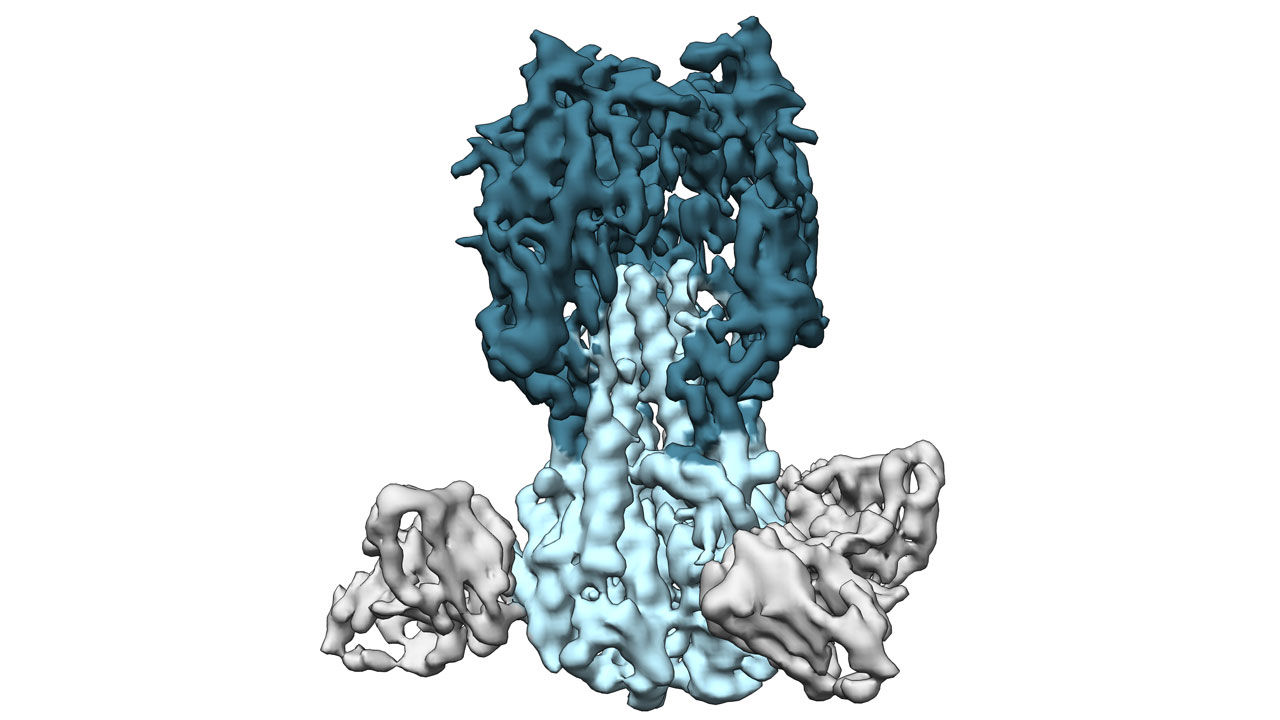 Các vaccine hiện nay tạo ra kháng thể nhắm vào phần đầu của hemagglutinin (HA) (màu xanh đậm). Vaccine mới tạo ra kháng thể (màu xám) bám vào phần cuống HA (màu xanh nhạt).