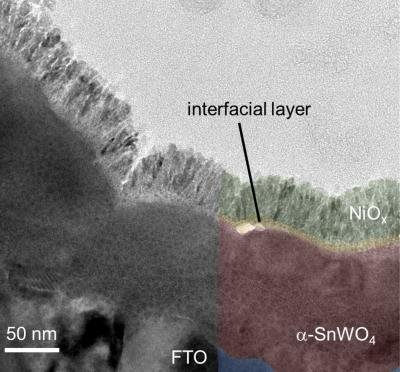 TEM- ảnh (ảnh kính hiển vi điện tử) phim α-SnWO4 (xanh lục) được phủ lớp NiOx 20nm (màu hồng). Giữa bề mặt phân cách của α-SnWO4 và NiOx có thể quan sát thấy một lớp màng bổ sung, có thể là SnO2.