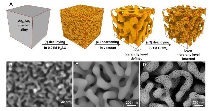 Thí nghiệm sự tự tổ chức của vật liệu: (A) Sơ đồ minh họa lộ trình, hợp kim chính được ngâm trong axit sunfuric loãng (i), hòa tan khoảng một nửa bạc. Vật liệu được xử lý nhiệt để làm thô (ii), phần bạc còn lại được tẩy sạch (iii). Vật liệu vàng có cấu trúc phân cấp với hai kích thước dầm khác nhau rõ ràng. Ảnh kính hiển vi điện tử các cấu trúc vi mô: (B) Ag-Au dạng nano, (C) nano Ag-Au thô và (D) Au nano phân cấp.