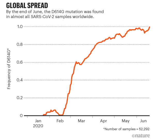 So với HIV, SARS-CoV-2 đang biến đổi chậm hơn nhiều nhưng có một đột biến nổi bật - nó nằm trong gene mã hóa protein gai, giúp các phần tử virus xâm nhập vào tế bào. Korber đã nhìn thấy sự đột biến xuất hiện lặp đi lặp lại trong các mẫu bệnh phậm của bệnh nhân mắc Covid-19. Ở vị trí axit amin thứ 614 của protein tăng đột biến, axit amin aspartate (viết tắt là D) thường xuyên được thay thế bằng glycine (viết tắt bằng G) do lỗi sao chép làm thay đổi một nucleotide trong chuỗi RNA 29,903 ký tự của virus này. Các nhà virus học gọi nó là đột biến D614G.